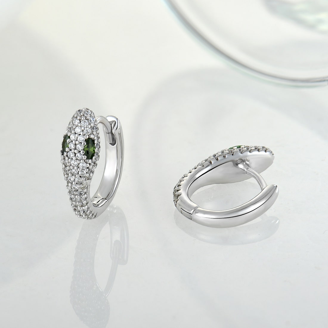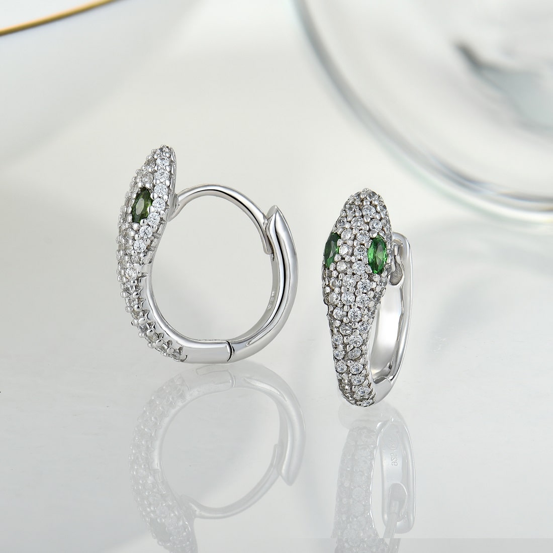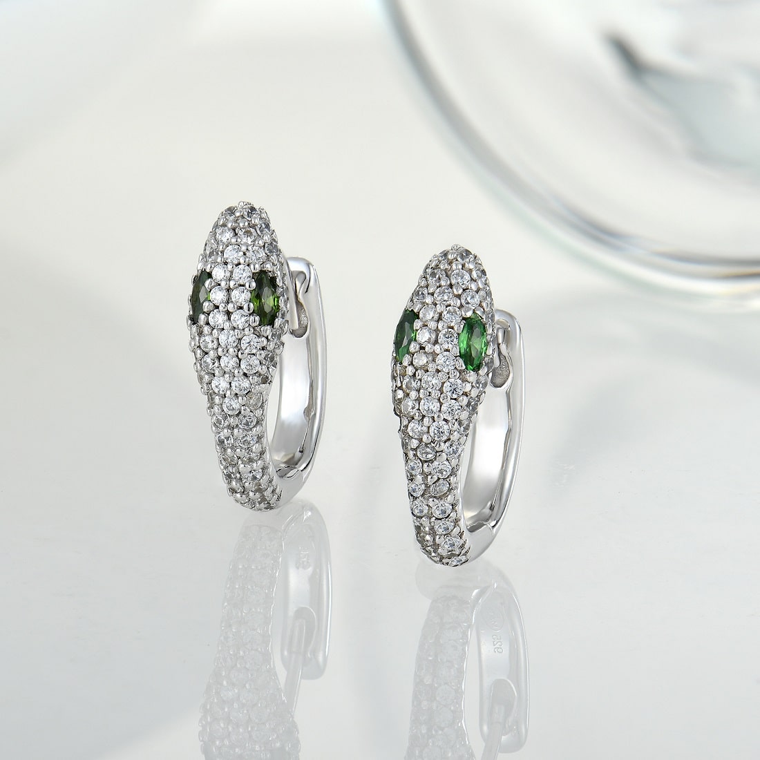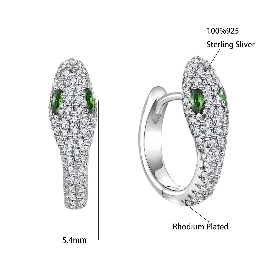 Exquisite sterling silver snake-shaped earrings, inlaid with cubic zirconia, rhodium plated to prevent the ring from tarnishing.